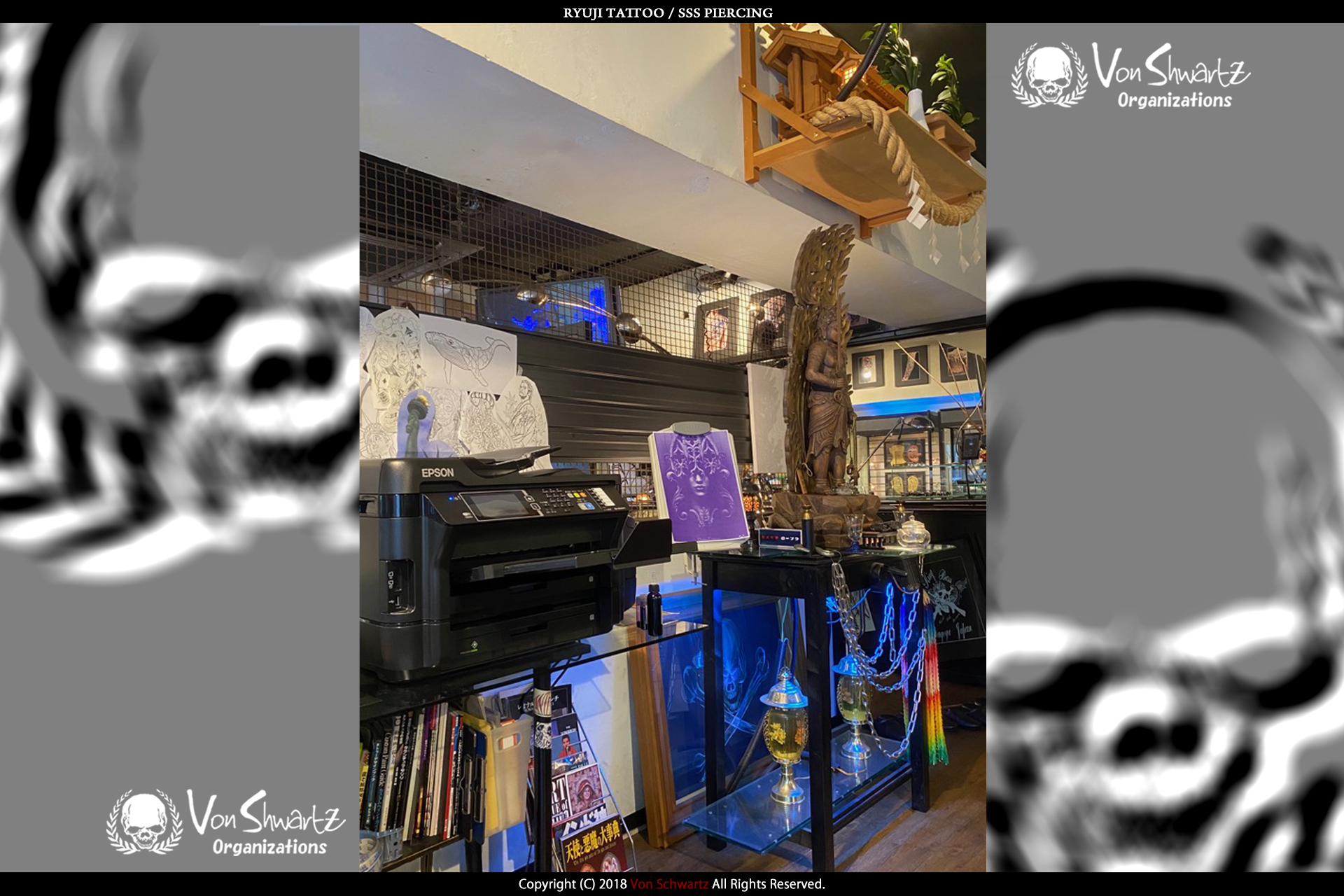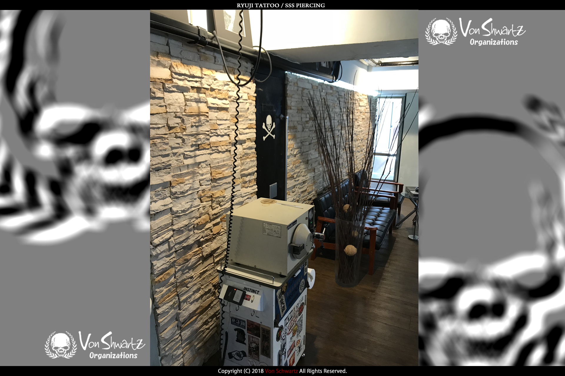 RYUJI TATTOO DESIGN & SSS PIERCING is brightly-lit and comfortable, with bright windows and natural light,conveniently located on the 2nd floor above a cafe.