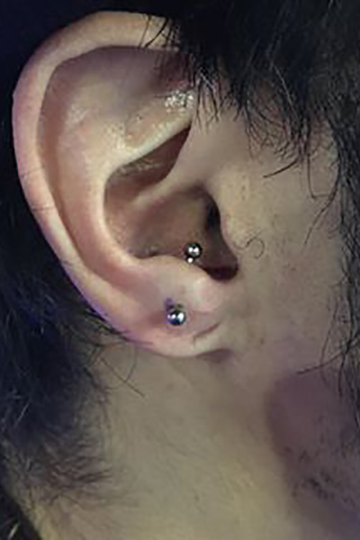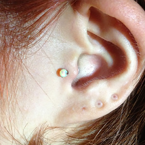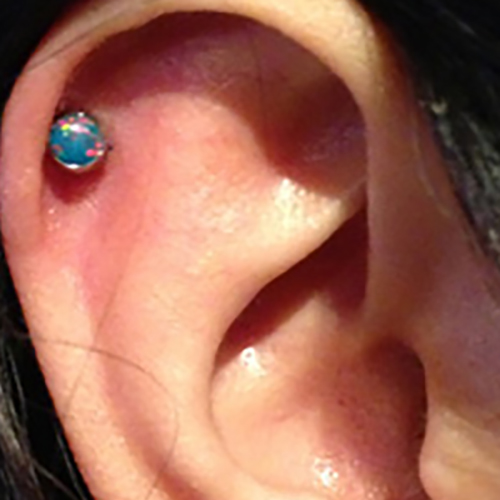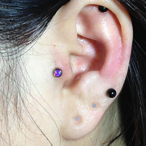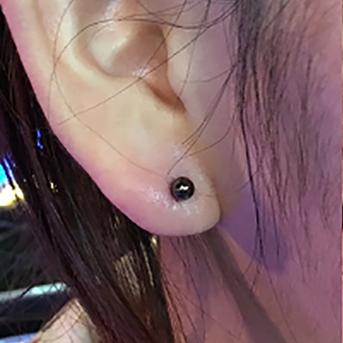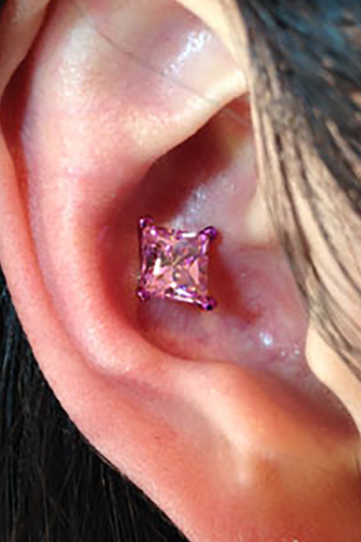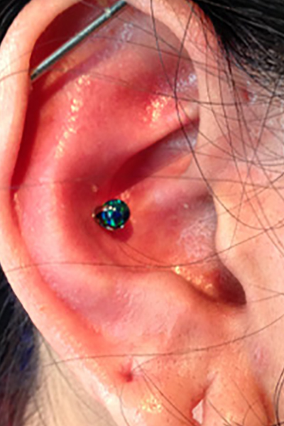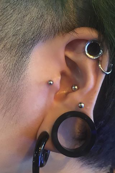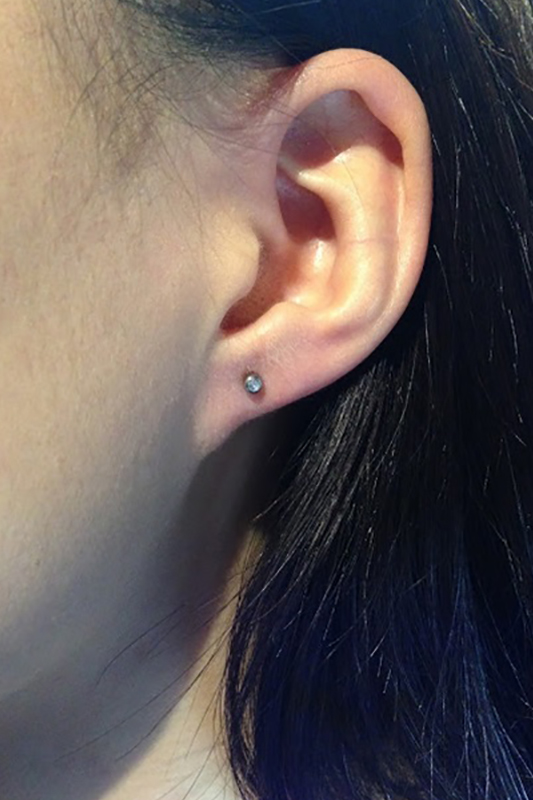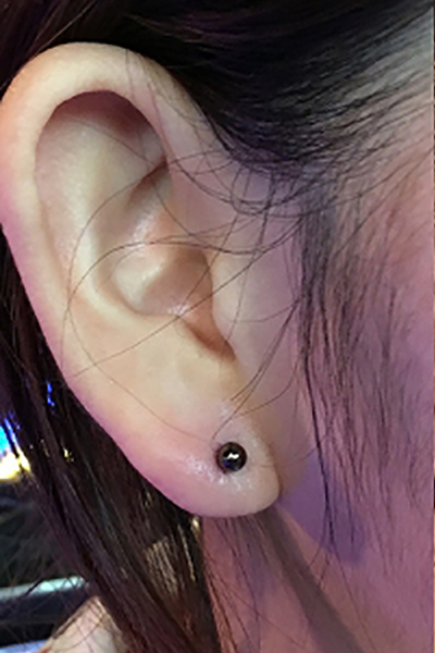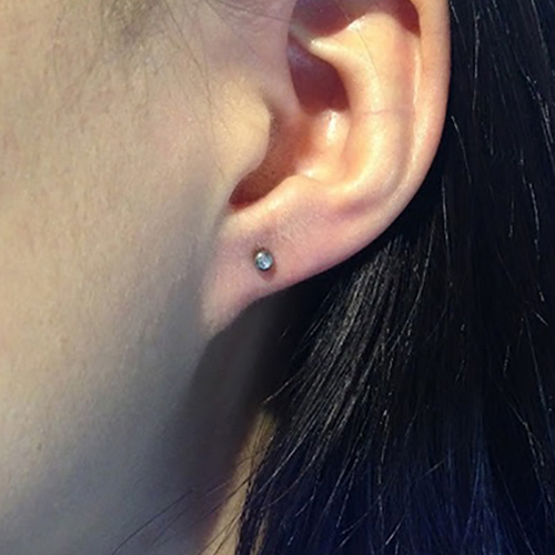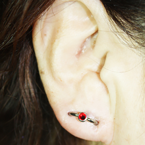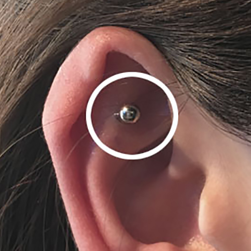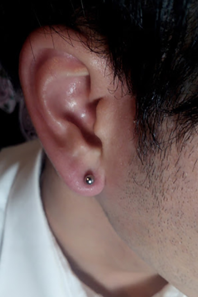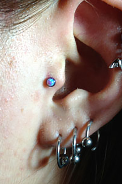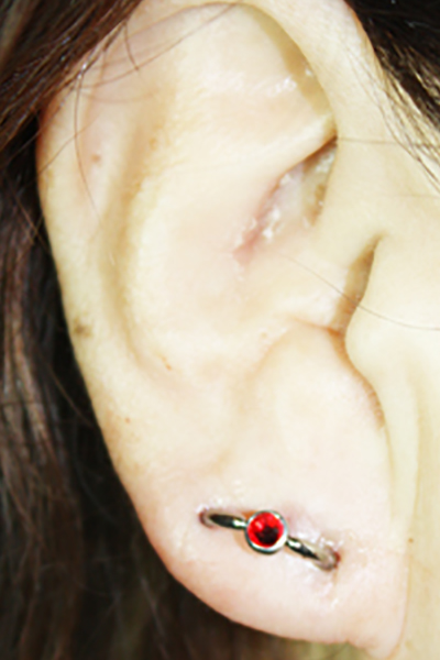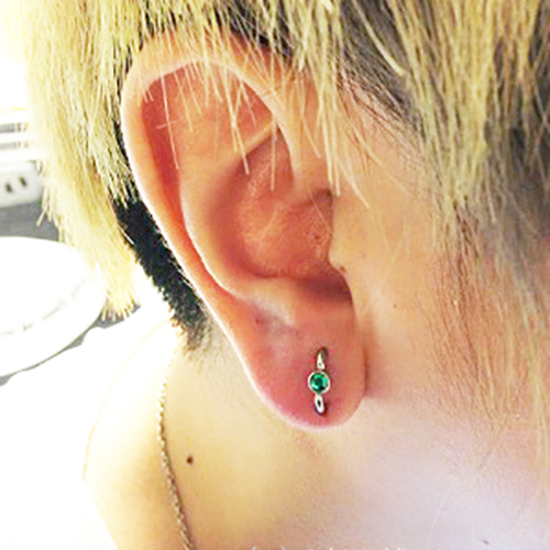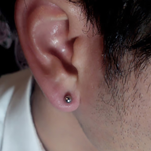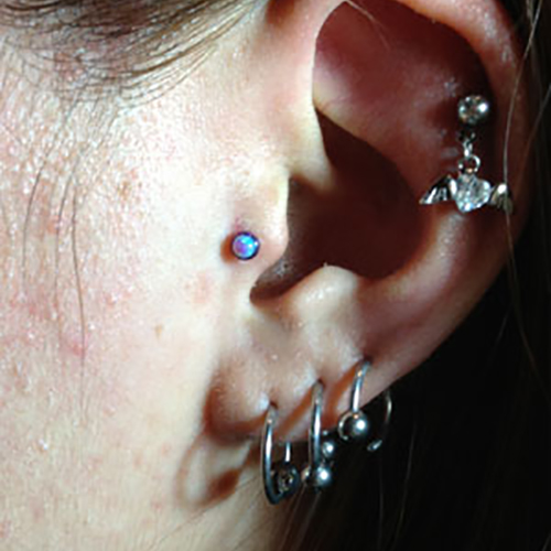 耳珠(顔側の耳孔の前にある三角に出っ張った軟骨)へのピアッシングです。