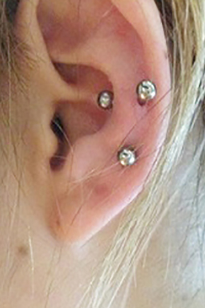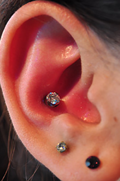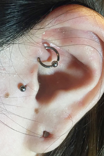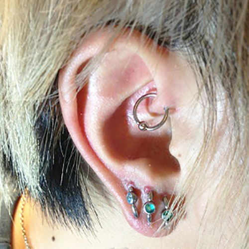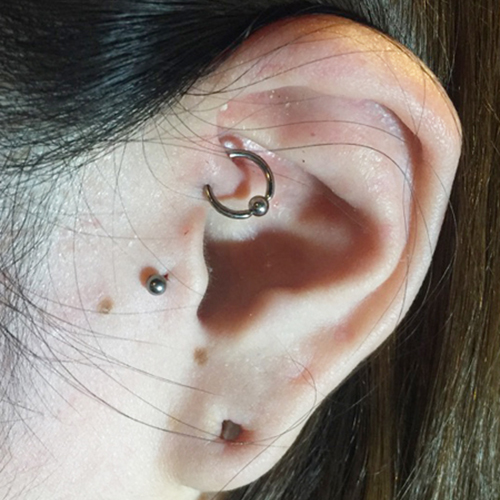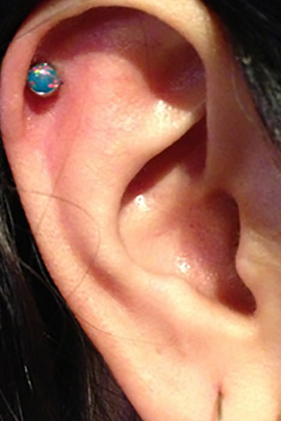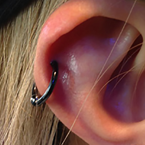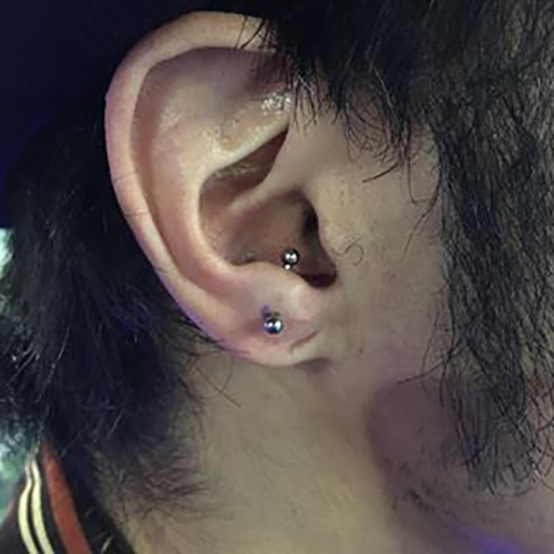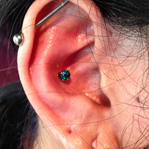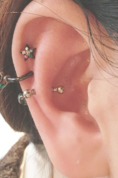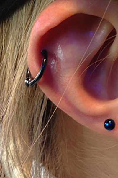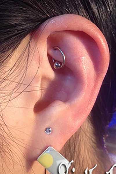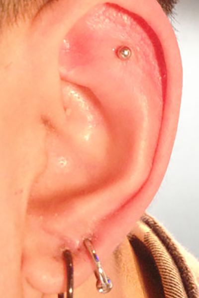 耳たぶの上部に位置する、上向きの軟骨へのピアッシングです。