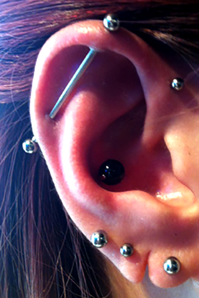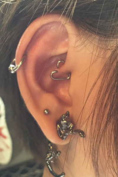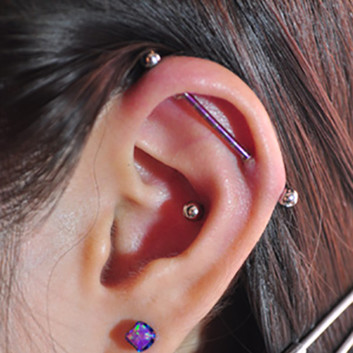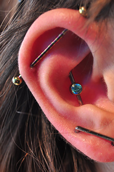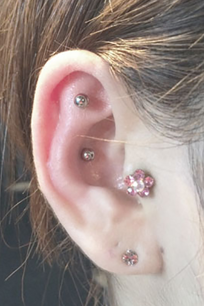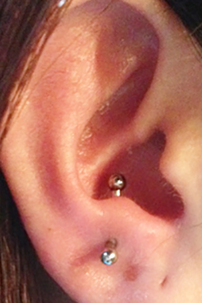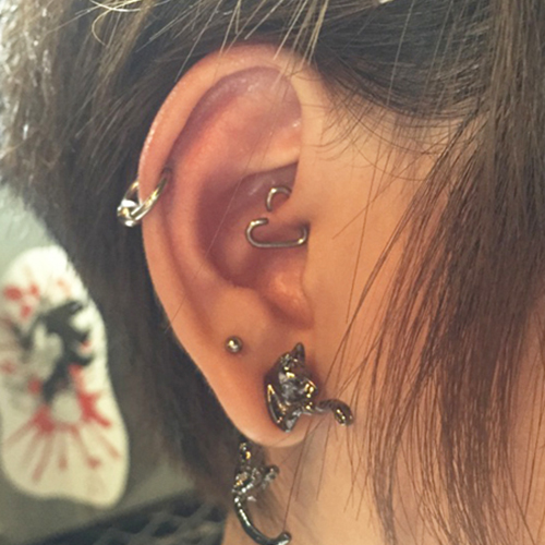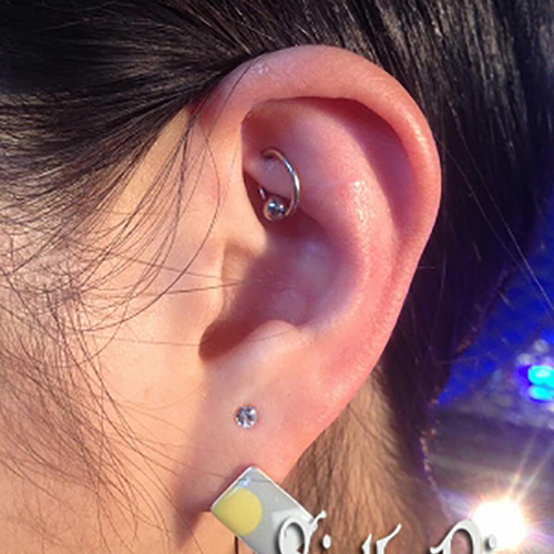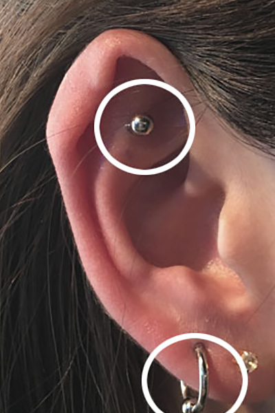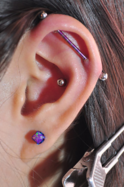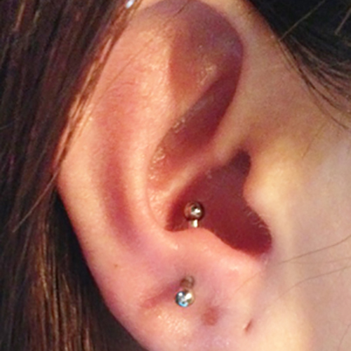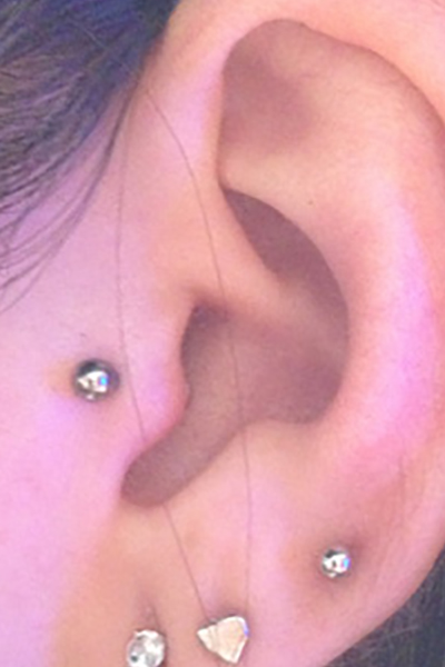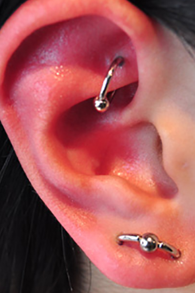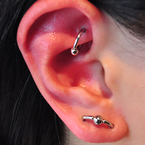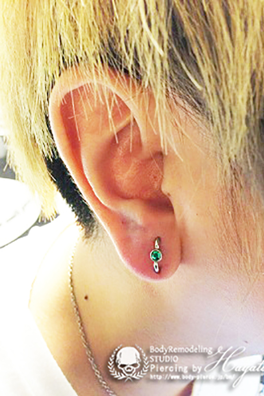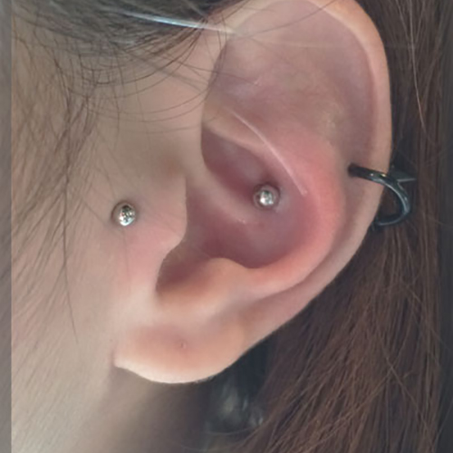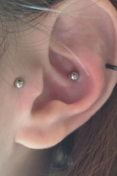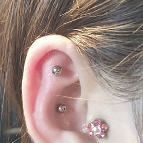 耳の中の二点をつなぐようにする人気の高いピアッシングです。