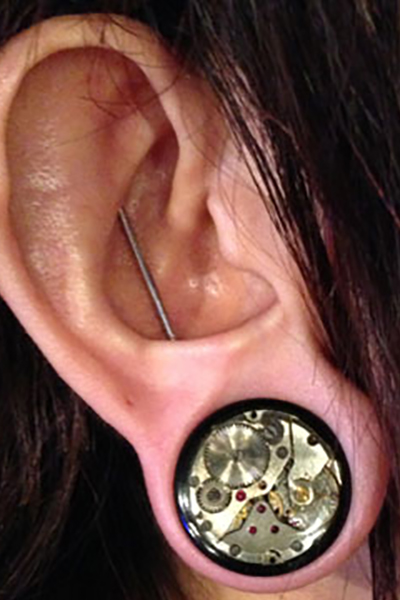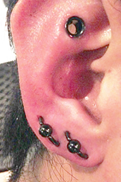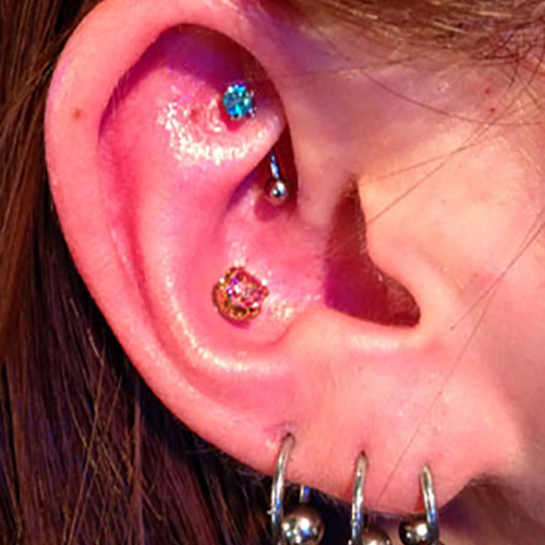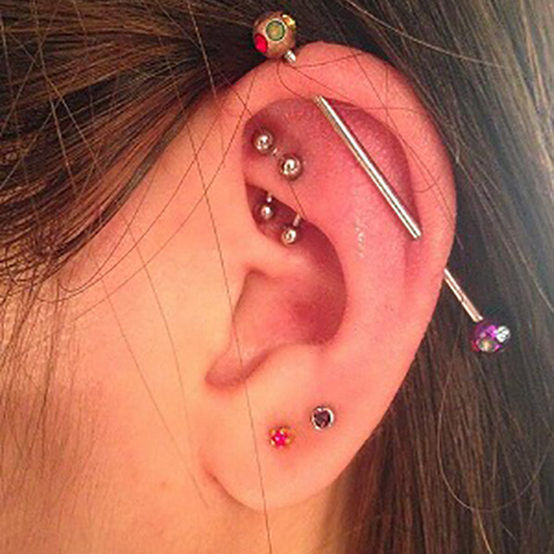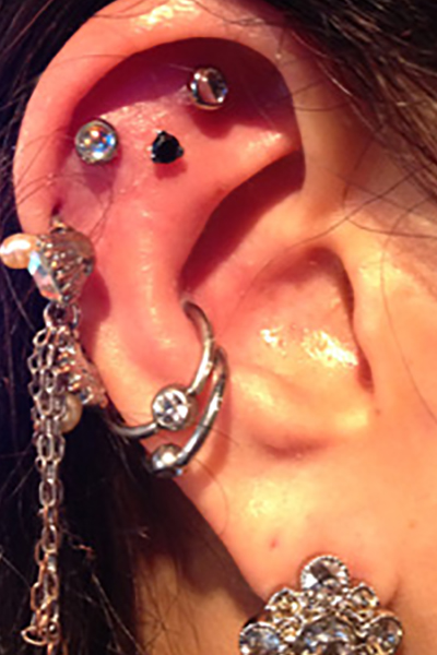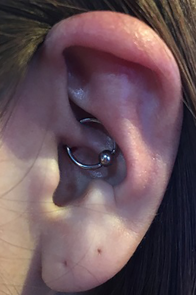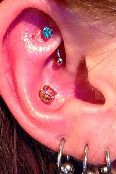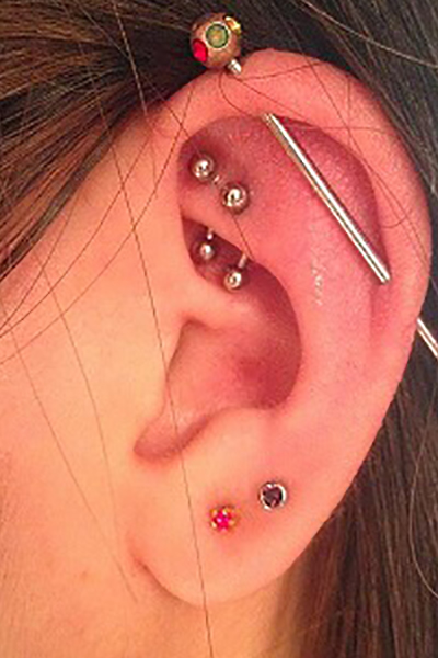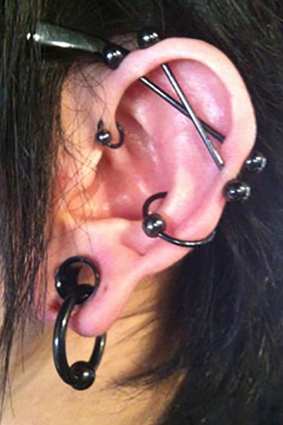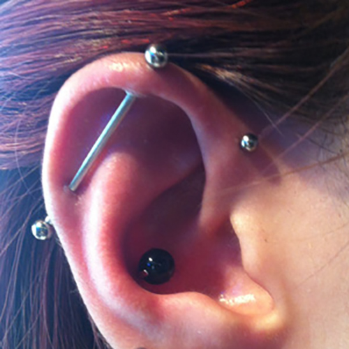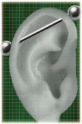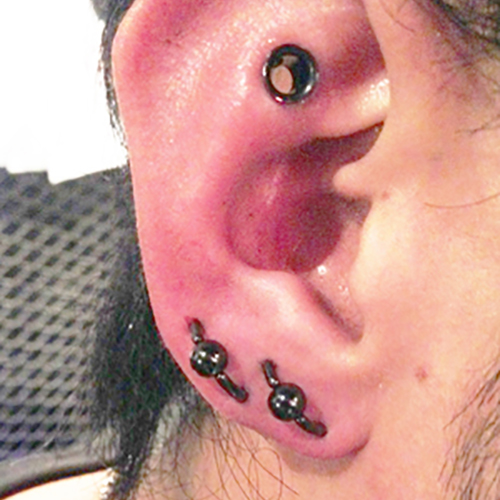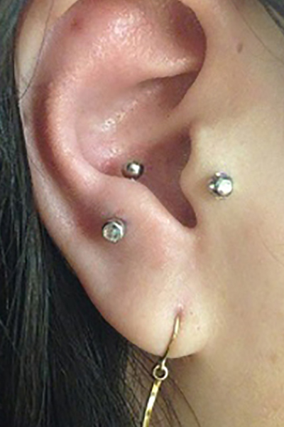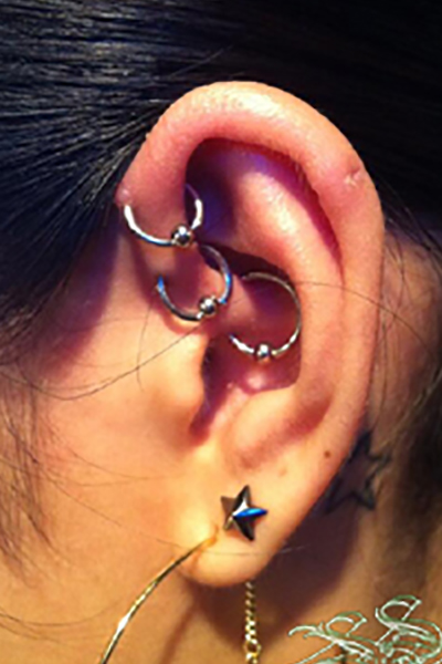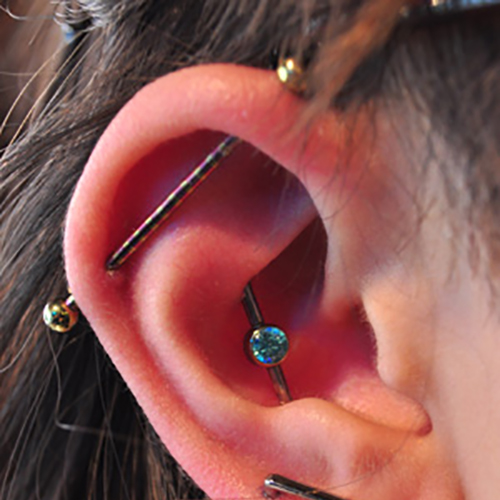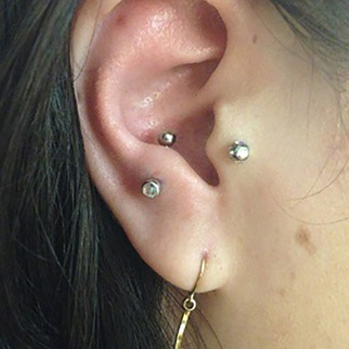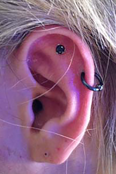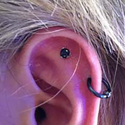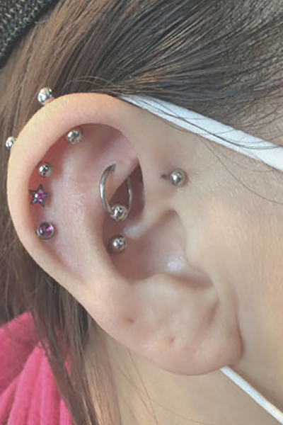 耳の中の二点をつなぐようにする人気の高いピアッシングです。