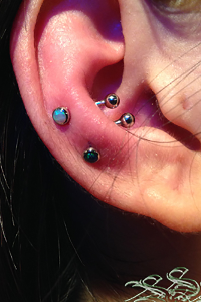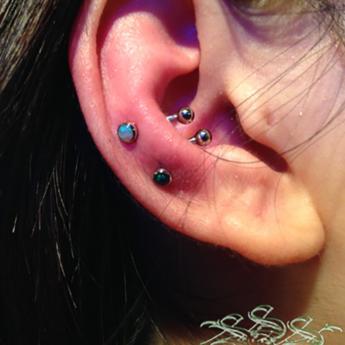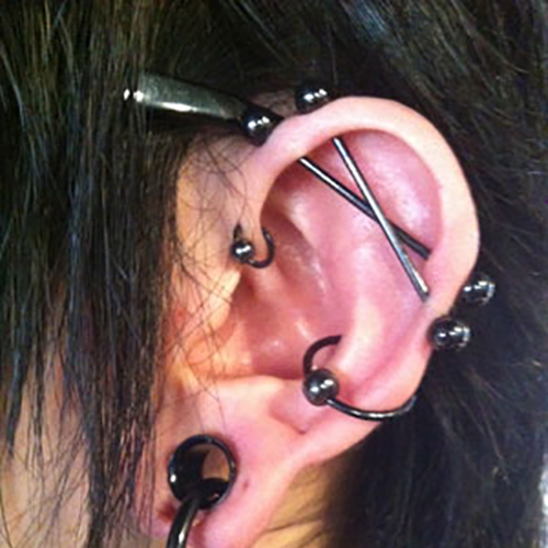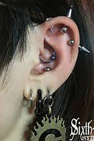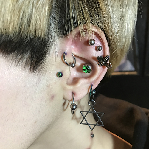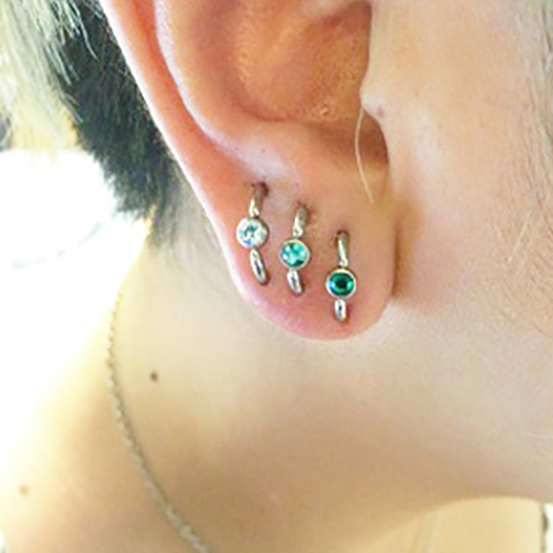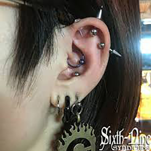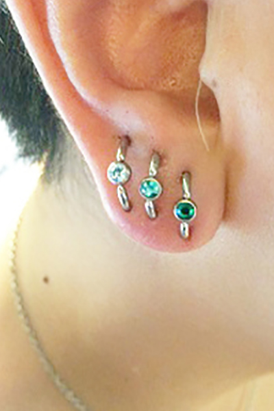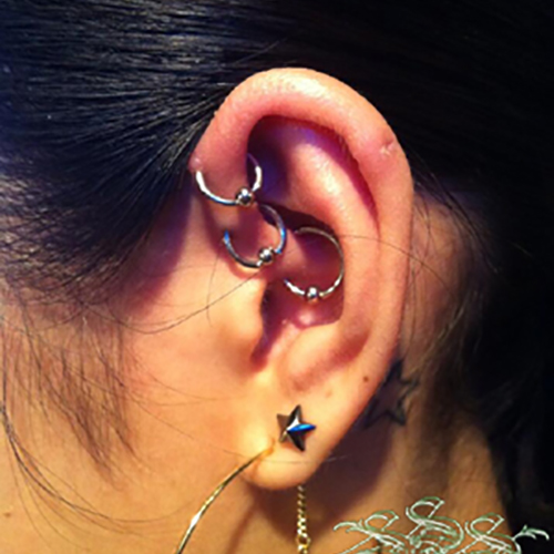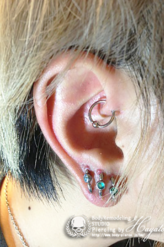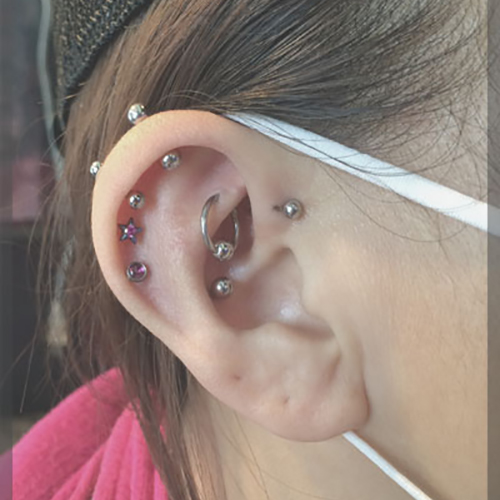 耳たぶでのオービタルが一般的ですが、へリックス、アウターコンク,また、カスタムしたジュエリーを使用する事で、正円のジュエリーではつなぐ事のできない部位同士でのオービタルも可能です。