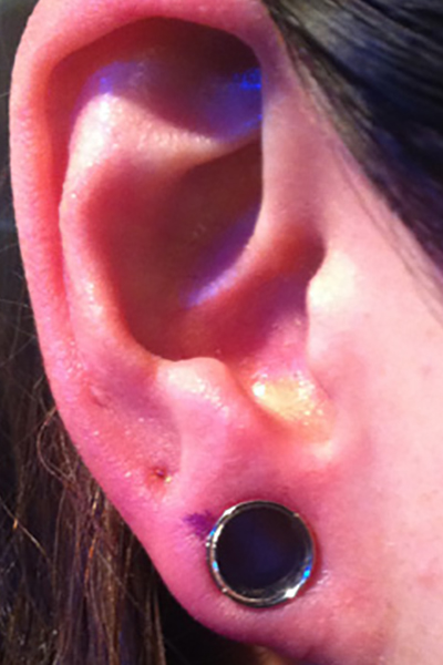 柔らかい皮膚と、軟骨の間の部分に分泌液がたまりやすく、アフターケアには注意が必要です。
